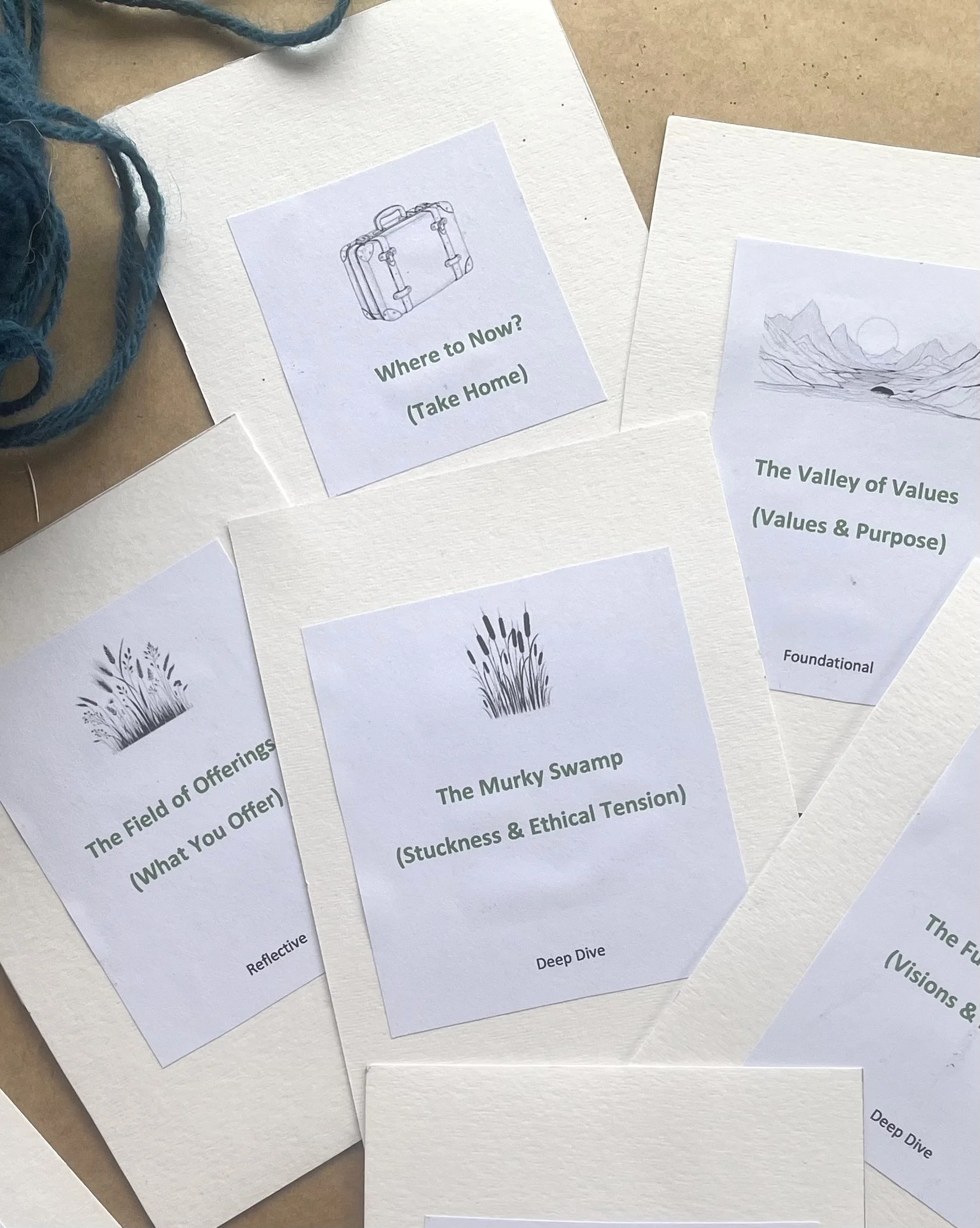 We begin with a blank page and a collection of symbolic ‘terrain tiles’, which represent different aspects of your practice. This hands-on, tactile approach invites you to physically interact with the materials, selecting the tiles that resonate most with where you are in your journey. Some tiles are foundational, while others are optional.