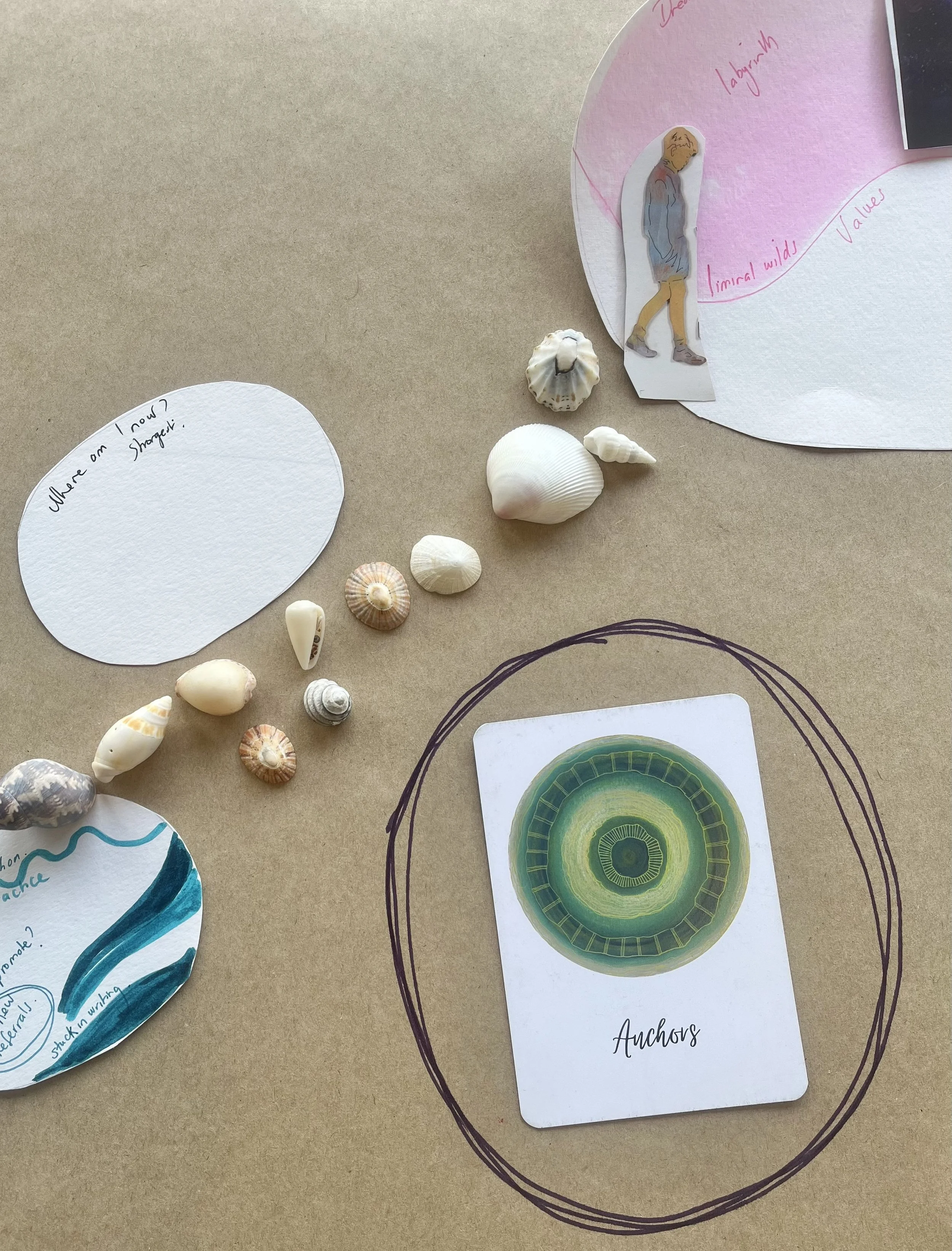 Throughout the session, a series of themed cards will guide your reflection. You will be invited to respond to the prompts on these cards, through drawing, writing, mark-making, or layering materials. In honouring the value of emergence- these prompts can often be just the beginning of the process. The focus here, is not on creative outcome but the process itself as the practice. As insight emerges, the map can be adjusted and reshaped.